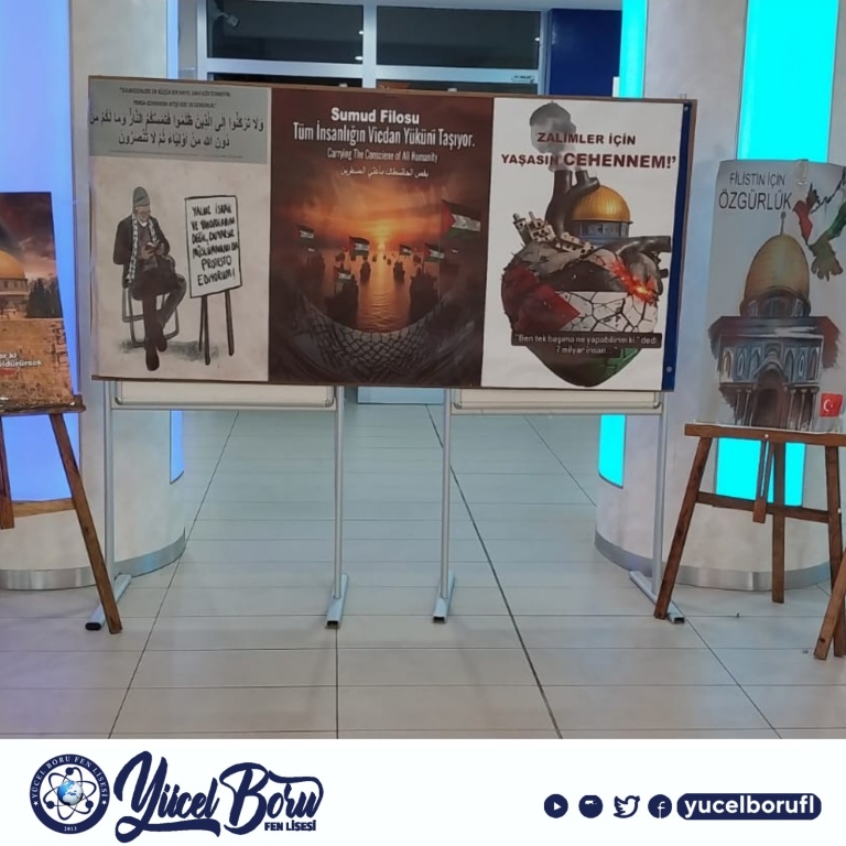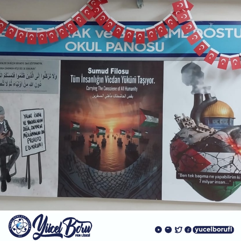 Bölgemizde ve küresel kamuoyunda büyük hassasiyetle takip edilen Filistin meselesi ile Küresel Sumud Filosu gündemi kapsamında, okulumuz Değerler Eğitimi Kulübü öğrenci ve öğretmenleri tarafından hazırlanan bilgilendirici panolarla öğrencilerimizde Filistin meselesi ve Küresel Sumud Filosu hakkında farkındalık oluşturuldu. Bu anlamlı çalışmada emeği geçen tüm öğrenci ve öğretmenlerimize teşekkür ediyoruz.